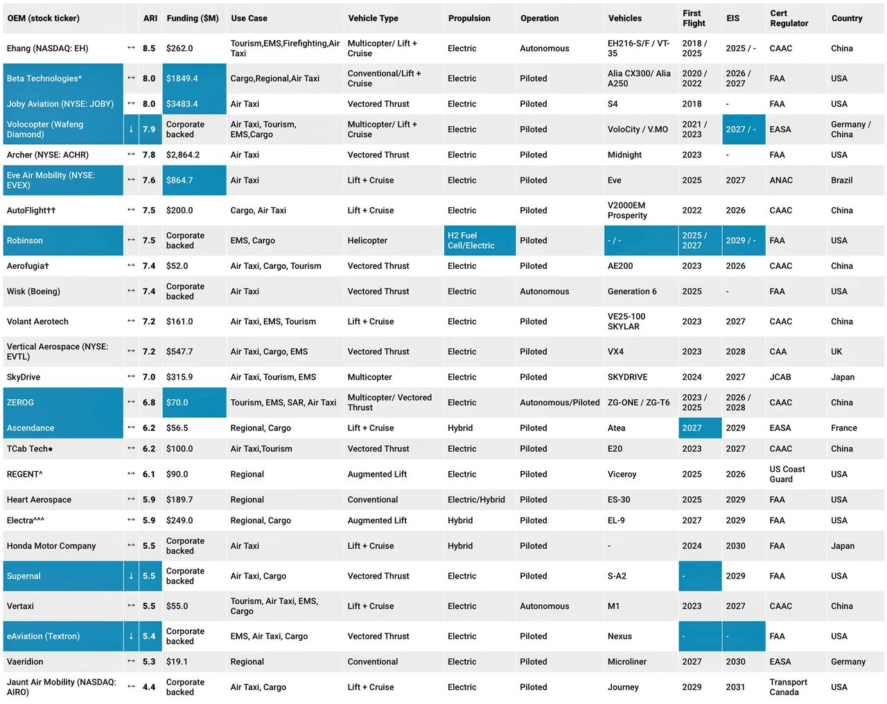 Un OEM, Dufour Aerospace, è uscito dall’indice, mentre quattro costruttoru hanno aumentato i propri finanziamenti (gli importi sono in milioni di dollari), ovvero Beta Technologies, a 554,9 milioni di dollari (finanziamenti aggiuntivi da parte degli investitori), Joby Aviation, a quota 500,5 milioni (offerta pubblica), Eve Air Mobility:  a 218,5 milioni (aggiunta da parte degli investitori) e la piccola ZeroG, più o meno 13,5 milioni di dollari (finanziamento serie A+++).
