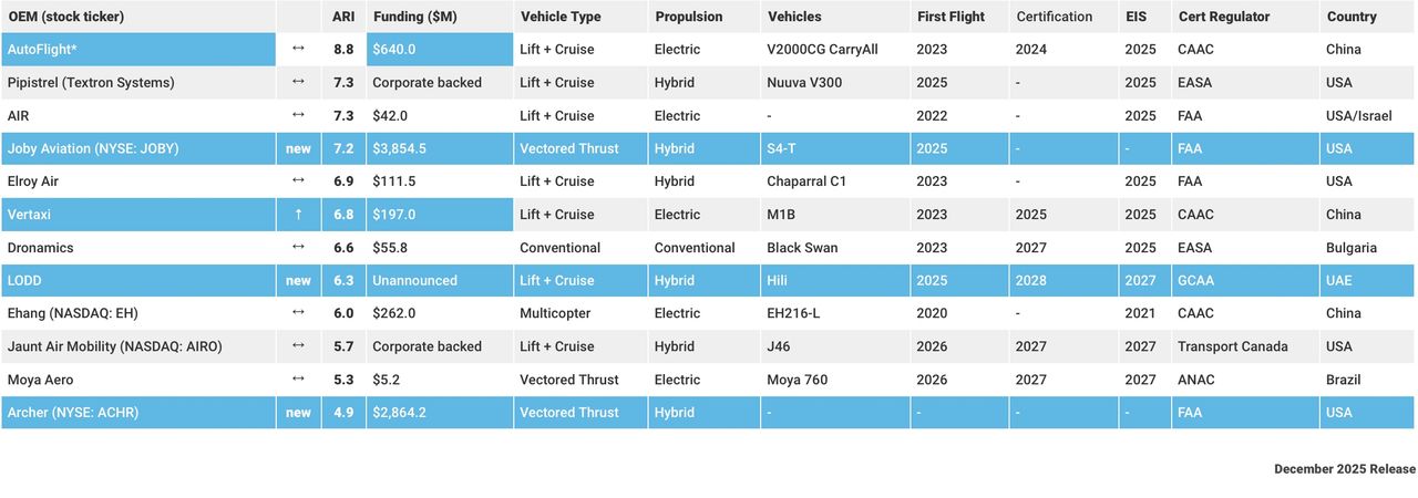 Advanced Air Mobility Reality Index: Cina e Usa dominano la Top Eight