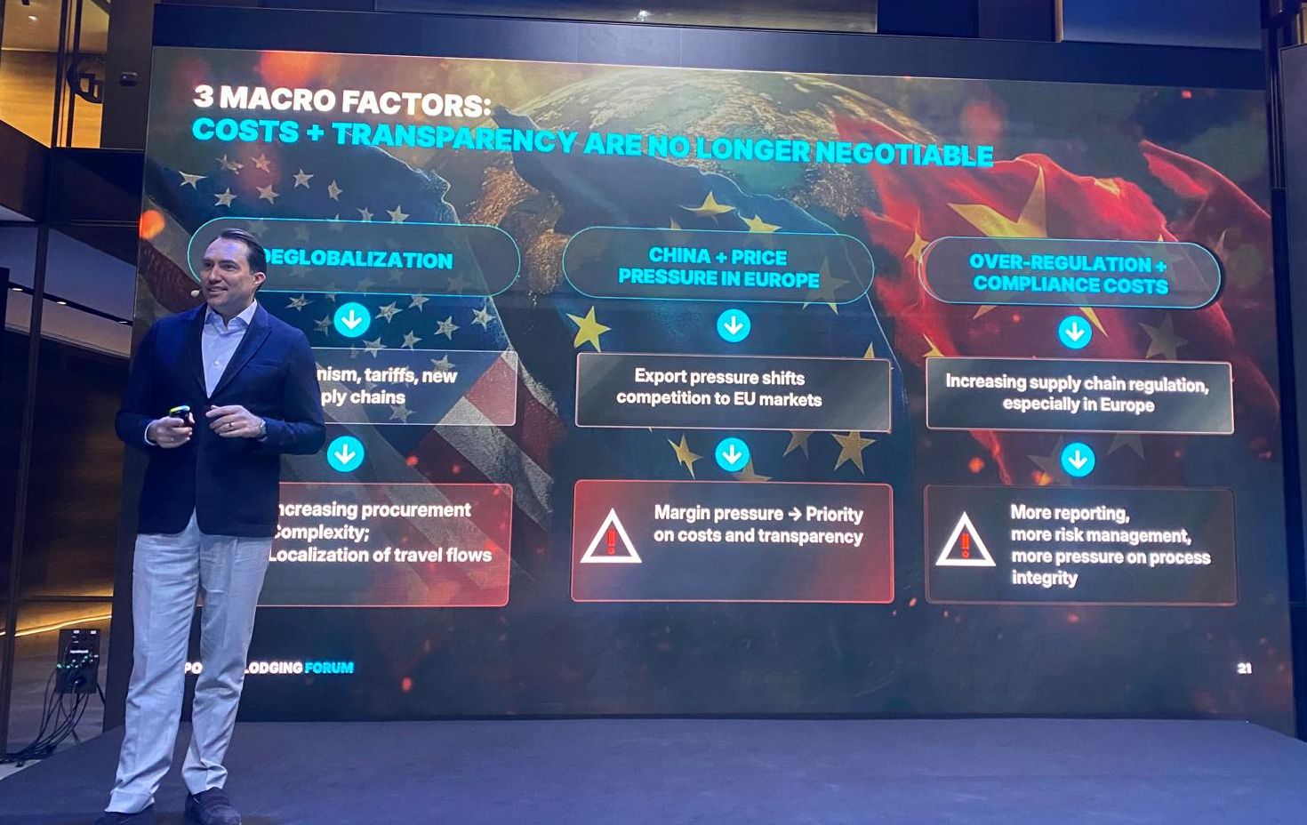 La 9° edizione del Corporate Lodging Forum a Milano condotta da Luca de Angelis (leggi qui la nostra recente intervista al Senior Vice President di tutta la regione Emea – Francia e Germania escluse – senza però lasciare il suo ruolo di Ceo dell’HRS Crew & Passenger Solutions) insieme al Leading Customer Success & Business Transformation della multinazionale tedesca Catello Di Napoli, si apre con la presentazione del nuovo Chief Revenue Officer Gabriele Indrieri (foto sotto), per poi passare la parola a Dario Fabbri, analista politico e giornalista.