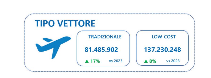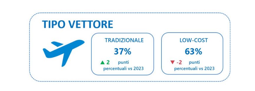 Interessante però notare come i vettori tradizionali crescano a doppia cifra, del 17%, sul 2023, contro “solo” un più 8% dei vettori low cost, con una quota di mercato di 2 punti percentuali riguadagnati sui rivali a basso costo.