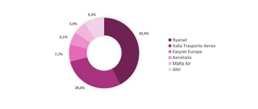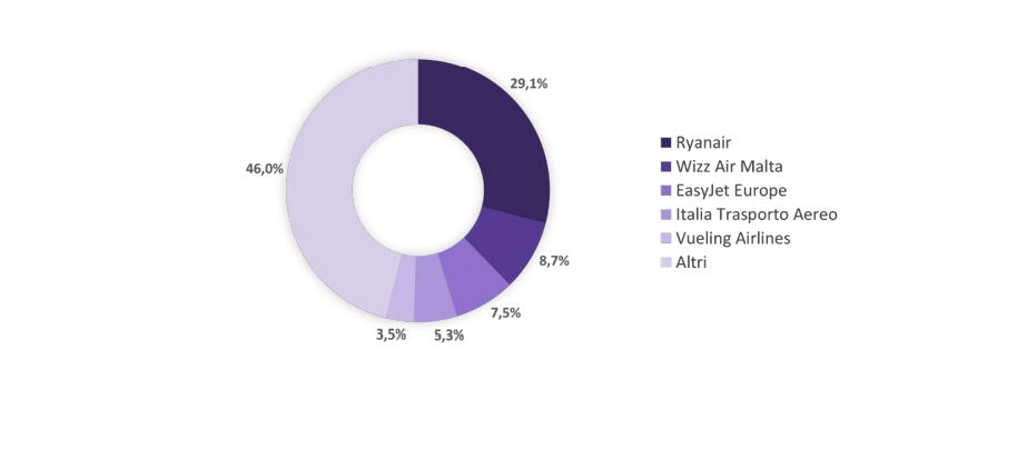 Il traffico passeggeri internazionale è stato pari a 146,1 milioni di passeggeri con un +13,9% sul 2023). Prima compagnia aerea è, naturalmente, Ryanair, con 42,4 milioni di pax (+14,5% sul 2023) e una quota invariata rispetto allo scorso anno del 29%. Al raddoppio – +90,2% – invece per i volumi di Wizz Air Malta al secondo posto, con 12,7 milioni di pax e una quota del 8,7%, (erano il 7,5% nel 2023). Wizz ha superato così EasyJet Europe che, invece, ha registrato 10,9 milioni di pax (+13,9%) e una quota del 7,5% (invariato sul 2023). Al quarto posto una Ita Airways in grande spolvero, con un più 24,8%, per 7,7 milioni di passeggeri e una quota del 5,3% (+1,3 punti sul 2023). Al quinto posto ancora Vueling, con 5 milioni di passeggeri e una quota del 3,5% (contro un 3,9% nel 2023).