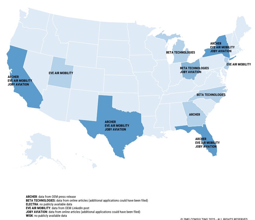 E’ stato il segretario del Dipartimento dei trasporti degli Stati Uniti Sean Duffy a presentare la strategia AAM statunitense, il culmine di anni di lavoro dell’AAM IWG (Interagency Working Group) su come si evolveranno i Taxi Volanti nei vari Stati statunitensi, con dieci di questi in pole position (vedi mappa sotto di SMG Consulting, che ringraziamo).