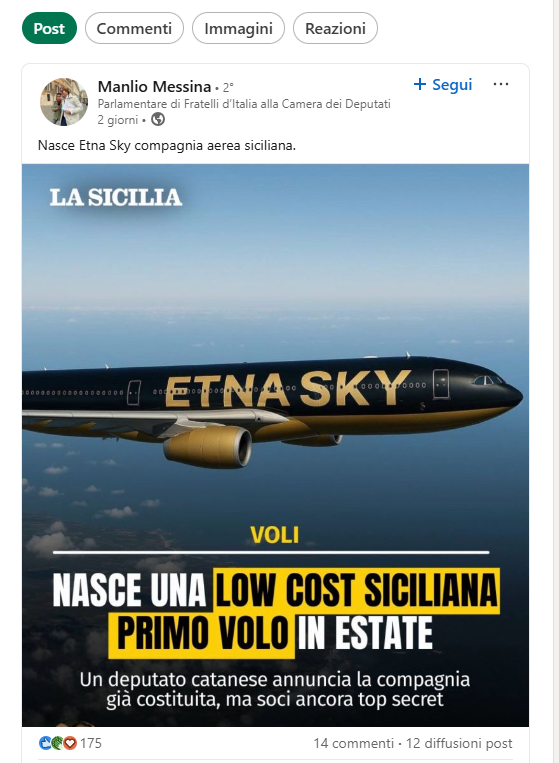 La nuova compagnia aerea Etna Sky –annunciata ufficialmente il 2 dicembre 2025 dal deputato siciliano Manlio Messina– ha iniziato a sciogliere alcune delle incognite sul profilo operativo e sulle rotte pianificate.