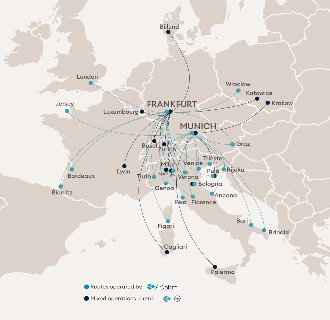 Per la Winter 2025/26, dall’hub di Francoforte sarà possibile raggiungere 18 mete, con l’ingresso di novità di grande rilievo come Amsterdam, Birmingham, Bordeaux, Basilea, Praga e Zurigo. Da Monaco le destinazioni servite sono 15, tra cui tre nuovi collegamenti verso Lubiana, Lussemburgo e Zurigo. Parallelamente Air Dolomiti ha ampliato le proprie operazioni all’interno del Gruppo Lufthansa, avviando attività per conto di Austrian Airlines e gestendo i collegamenti sull’hub di Vienna dagli aeroporti italiani di Milano Linate, Bologna e Venezia e da quelli europei di Belgrado e Kosice.