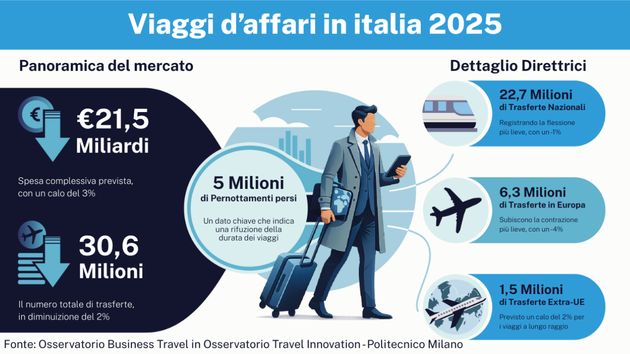 Secondo l’Osservatorio, il 2025 è stato segnato da un contesto macroeconomico complesso: dazi, tensioni geopolitiche, politiche protezionistiche e differenziazione delle strategie aziendali hanno spinto molte imprese italiane a ridurre o rimodulare le trasferte, privilegiando viaggi domestici o verso Paesi considerati a minore rischio.