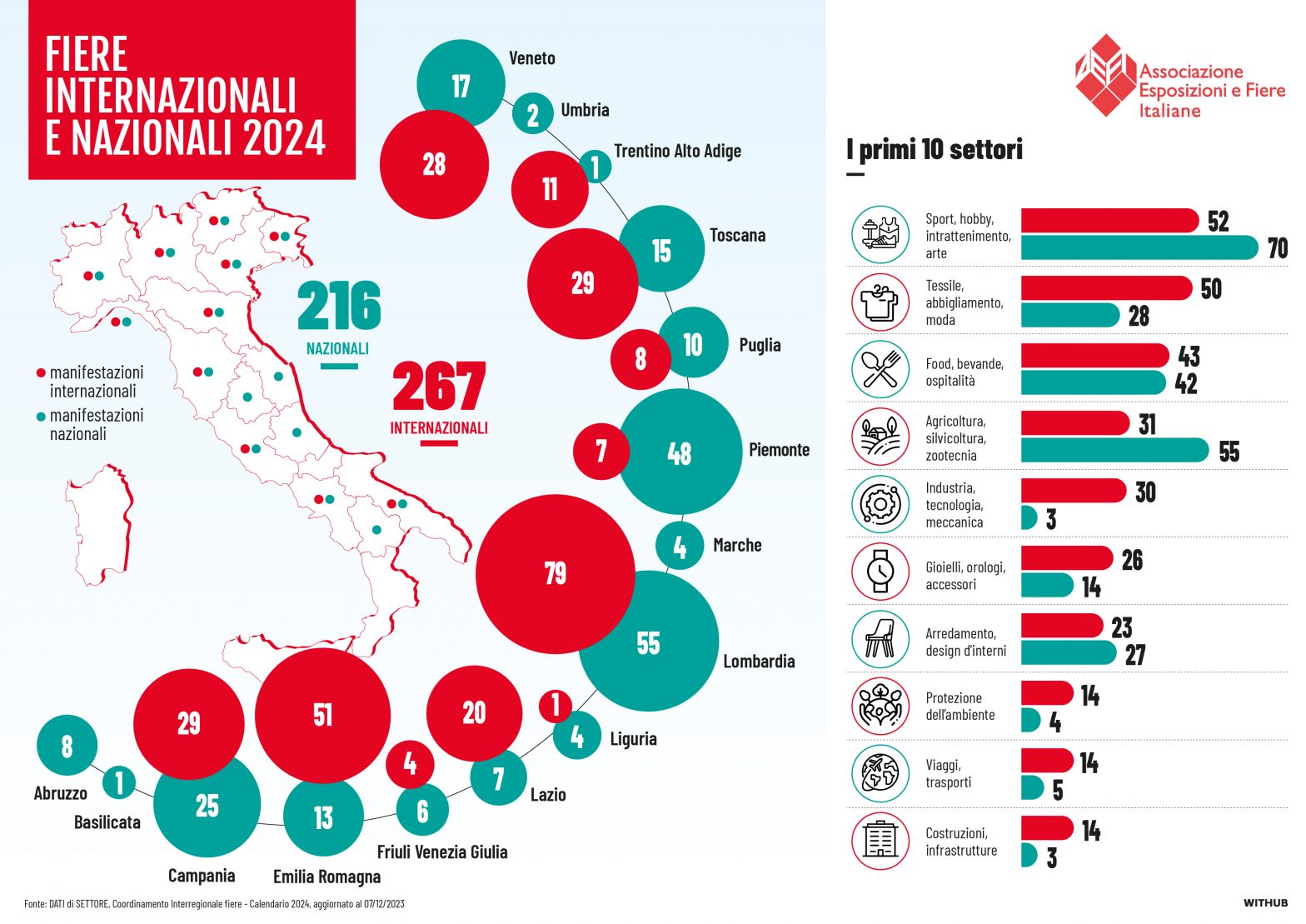 Secondo i dati di settore del Coordinamento Interregionale Fiere nel 2026 saranno 878 gli appuntamenti, con 276 fiere internazionali e 202 nazionali, guidato dal settore Food&Beverage (il 12% sul totale eventi) seguito dal tessile, abbigliamento, moda assieme all’aggregato sport, hobby, intrattenimento e arte (11%), dalla tecnologia e meccanica (9%) da agricoltura, silvicoltura e zootecnia (8%)e dai gioielli, orologi e accessori (7%).