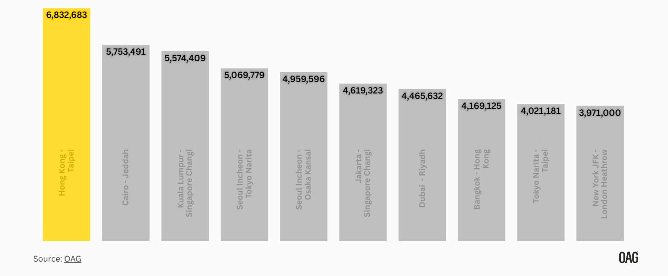 Anche tra le rotte internazionali domina l’Asia, con l’Hong Kong-Taipei (ma forse i cinesi la considererebbero una rotta domestica…) la più gettonata, seguita dalla Cairo-Jeddah e dalla Kuala Lumpur-Singapore. Al decimo posto l’unica rotta Occidentale in classifica, con la Londra Heathrow-New York JFK.