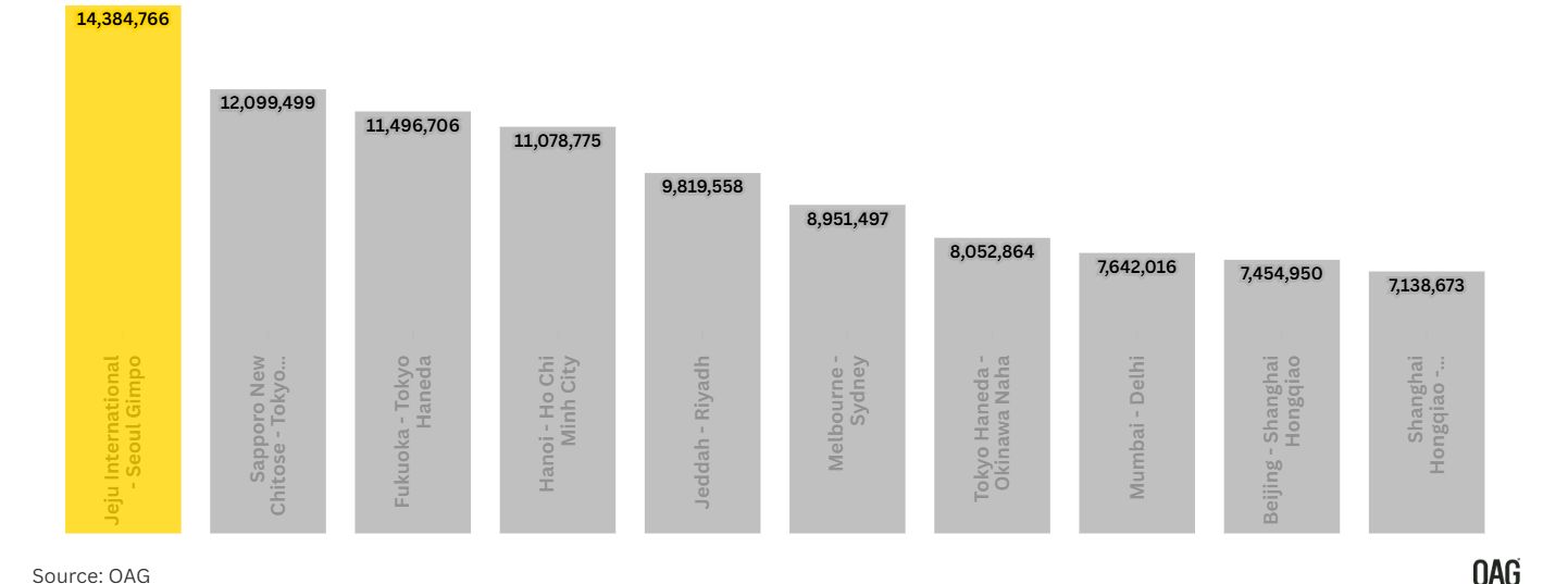 Nove delle dieci rotte più trafficate operano nella regione dell’Asia del Pacifico, e quella più trafficata del 2025 è da Jeju (CJU) a Seoul Gimpo (GMP). Questa rotta conta 14,4 milioni di posti programmati nel 2025, ciò equivale a quasi 39.000 posti giornalieri operanti su questo breve tratto di sole 243 miglia nautiche. La capacità sulla rotta è superiore dell’1% ai livelli del 2024 con ben sette vettori che la volano, ma rimane inferiore del 17% ai livelli del 2019.