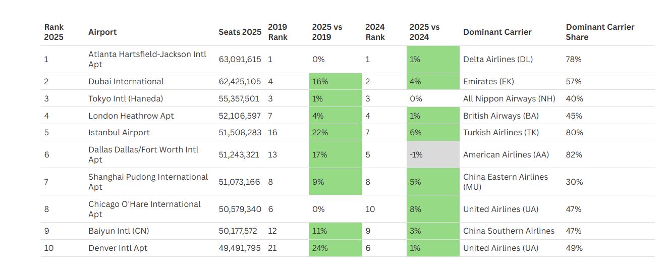 Lo scalo della Georgia di Atlanta Hartsfield-Jackson (ATL) – principale hub di Delta Air Lines – è, anche per il 2025, l’aeroporto con la maggior offerta di posti al mondo, con 63,1 milioni e una capacità aumentata dell’1% rispetto al 2024, raggiungendo un livello simile a quello del 2019 quando transitarono nello scalo oltre 108 milioni di passeggeri, secondo la consueta analisi annuale di OAG. Malgrado in alcuni mesi l’offerta dell’Aeroporto Internazionale di Dubai (DXB) superi quello di Atlanta, a livello annuale rimane il secondo aeroporto più trafficato a livello globale con 62,4 milioni di posti. La capacità delle compagnie aeree dello scalo – in particolare Emirates – ha registrato una crescita significativa dal 2019, con un aumento dei posti del 16% e una crescita della capacità del 4% su base annua, quindi potrebbe presto sorpassare l’hub della Georgia. L’aeroporto di Tokyo Haneda (HND) – Hub di ANA – si posiziona al terzo posto con 55,4 milioni di posti, senza mostrare variazioni significative rispetto all’anno precedente, ma comunque superiori dell’1% ai livelli del 2019.