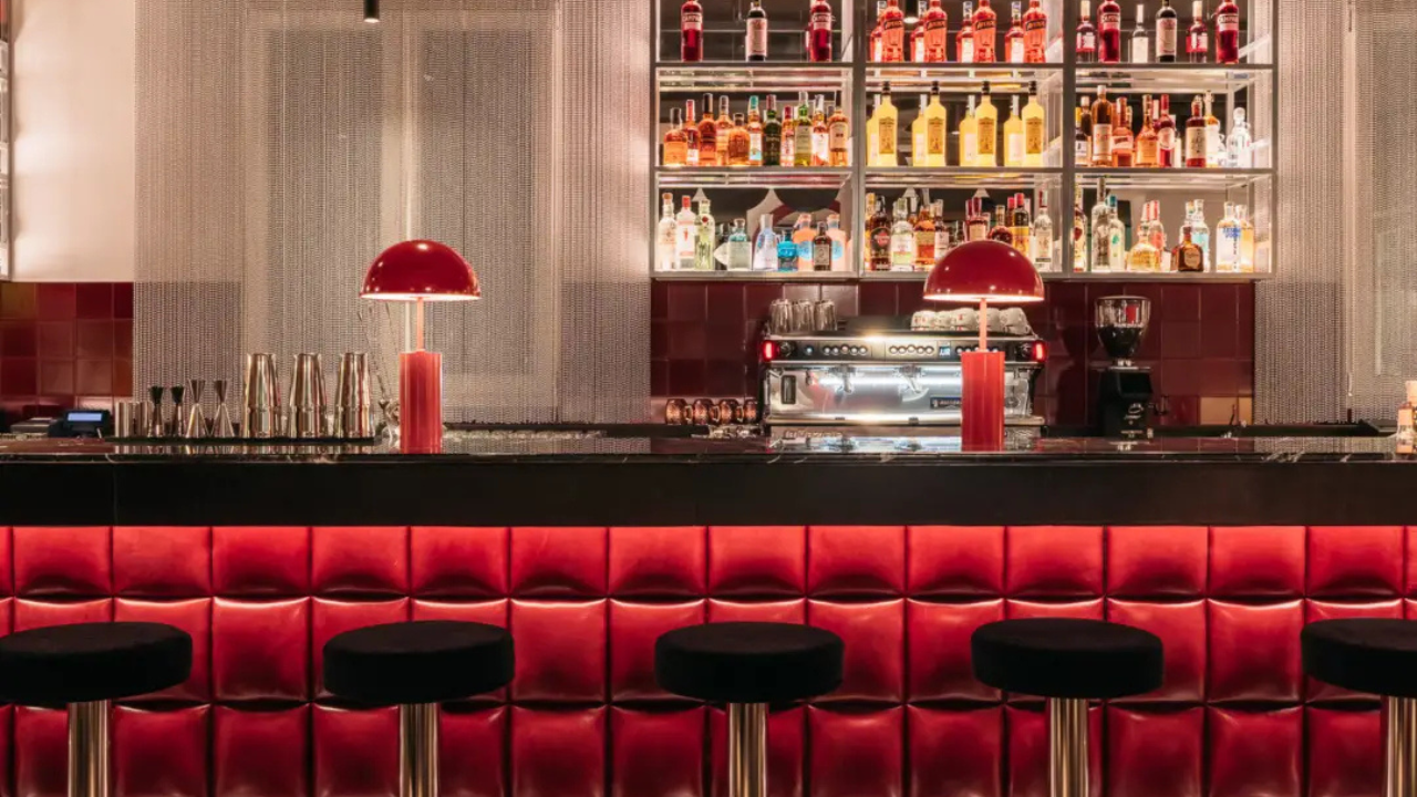 Specchi collocati su pareti e soffitti moltiplicano le prospettive e creano giochi visivi inattesi, mentre la palette cromatica – verde smeraldo, arancio bruciato e rosso intenso – dialoga con superfici in terrazzo, dettagli in ottone e velluti, evocando l’estetica cinematografica della Roma felliniana.