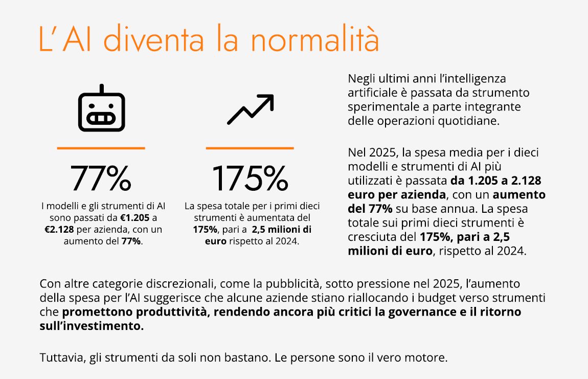- Gli investimenti in AI sono cresciuti del 77%, raggiungendo 2.128 euro per azienda, mentre la spesa complessiva sui dieci modelli più diffusi di Ai è aumentata del 175%.