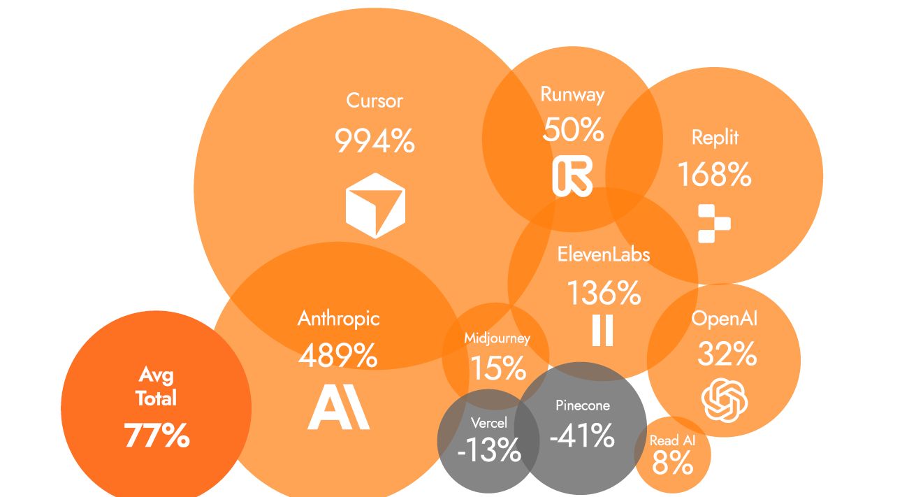 L’inizio del 2025 ha segnato un chiaro cambiamento nella destinazione dei budget per l’AI. La spesa media per Cursor, un editor di codice AI, è aumentata del 994%, seguita da Anthropic, dietro Claude, che ha registrato un incremento del 489% (vedi sotto l’infografica).