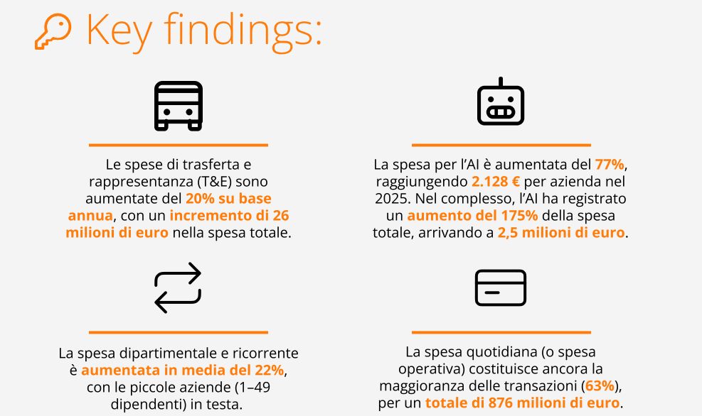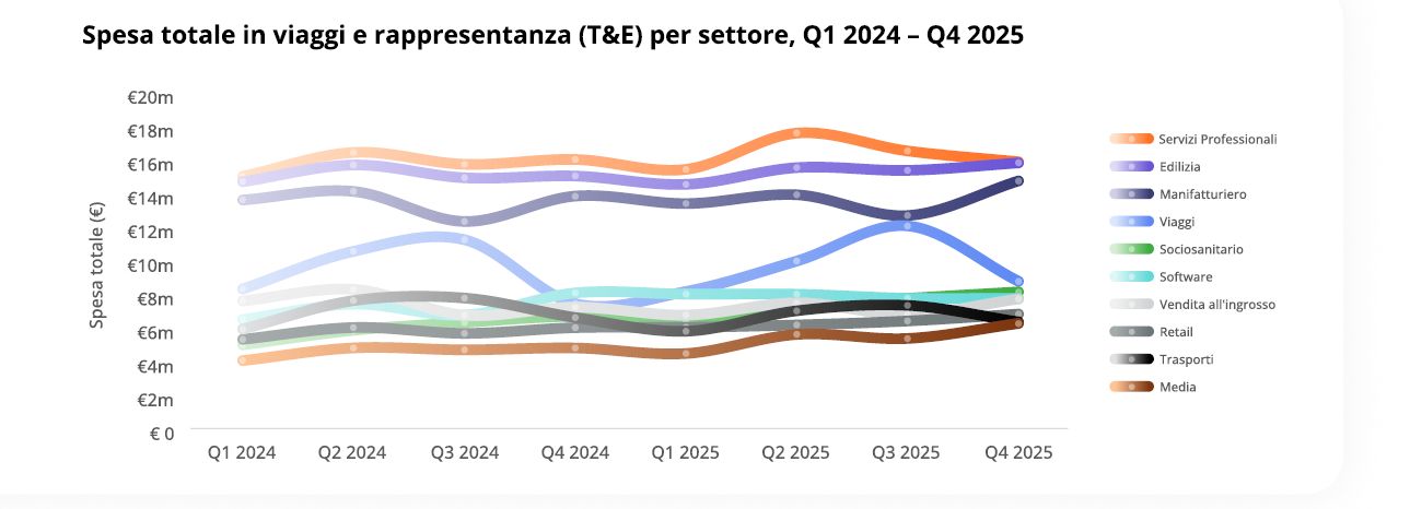 - Le spese T&E sono aumentate del 20% su base annua, con un incremento di 26 milioni di euro nella spesa totale.